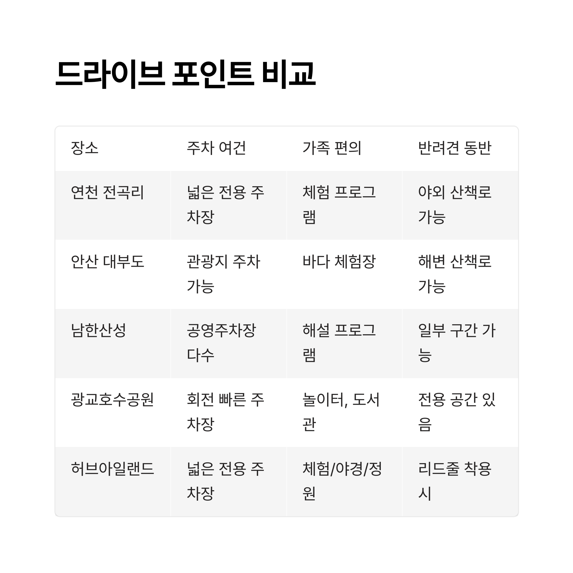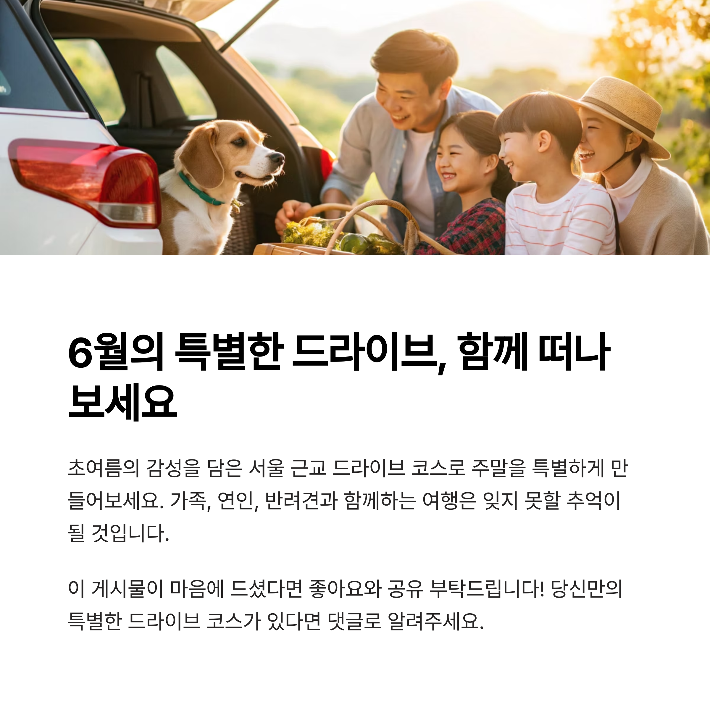이번 글에서는 가족 또는 반려견과 함께 떠나기 좋은 서울 근교 드라이브 명소 5곳을 소개합니다.