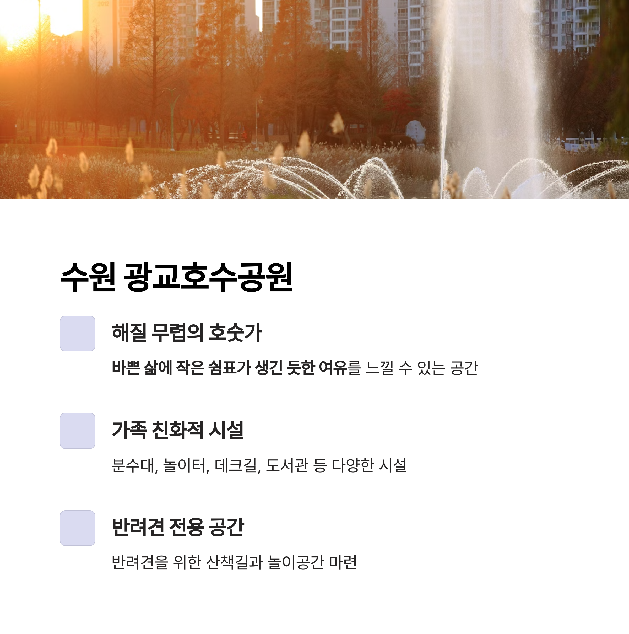 광교호수공원 | 회전 빠른 공영주차장 | 놀이터, 도서관 등 시설 우수 | 가능 (전용 공간 있음) |